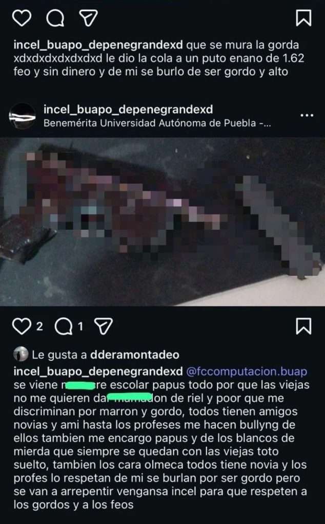 El caso del estudiante poblano mostró similitudes con el de Lex Ashton. Los mensajes del joven de la BUAP seguían ese patrón: en uno de ellos publicó la imagen de un arma y mencionó su intención de “hacer justicia” por sentirse marginado.