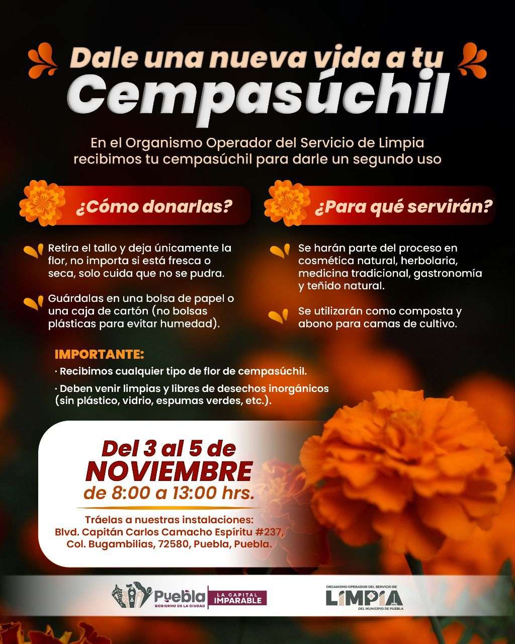 Como parte de esta iniciativa, se habilitó un Centro de Acopio Temporal para recolectar flores de cempasúchil que permanecerá hasta el 5 de noviembre, en un horario de 8:00 a 13:00 horas, en Blvd. Capitán Carlos Camacho Espíritu No. 237, Colonia Bugambilias, para dar una segunda vida a las flores que tradicionalmente son desechadas tras las festividades.