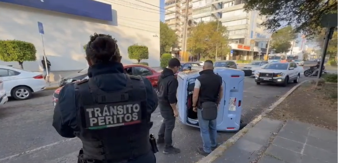 Un accidente vial entre dos vehículos registrado la mañana de este lunes en la intersección de la 43 Oriente y 2 Sur, cerca del Boulevard 5 de Mayo, dejó como saldo la volcadura de una unidad.