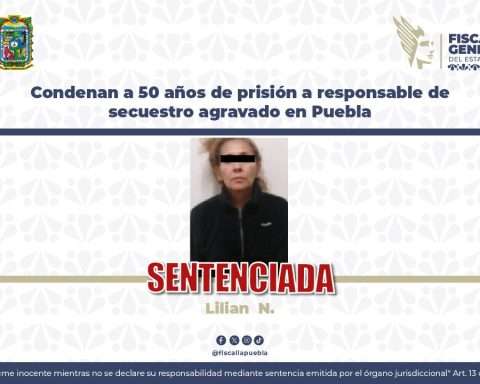 La Fiscalía General del Estado de Puebla (FGE) obtuvo sentencia condenatoria contra Lilian N., responsable del delito de secuestro agravado, hecho ocurrido en la