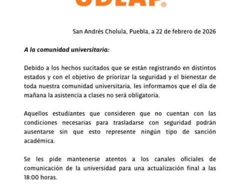 Ante la situación de violencia que se ha registrado en varias entidades del país, la UDLAP anunció este domingo que la asistencia a clases