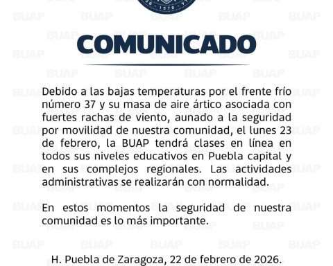 La Benemérita Universidad Autónoma de Puebla (BUAP) anunció que, debido a las bajas temperaturas generadas por el frente frío número 37 y las fuertes