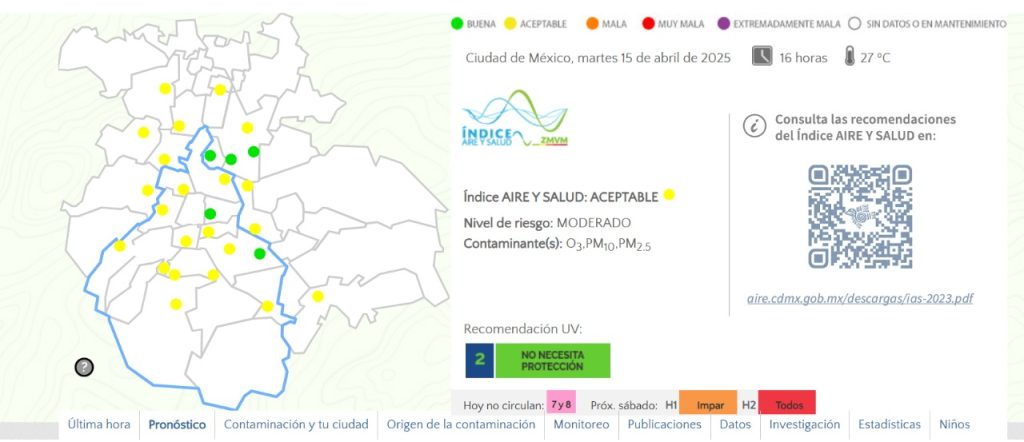 Este martes, la calidad del aire en la Ciudad de México presentó variaciones a lo largo del día. Durante la mañana, se registraron niveles de calidad del aire que oscilaban entre «aceptable» y «mala» en diversas alcaldías, con algunas zonas como Tláhuac y Nezahualcóyotl reportando condiciones desfavorables. Sin embargo, hacia la tarde, la situación mejoró en la mayoría de las áreas, alcanzando niveles de calidad del aire considerados «aceptables» con un riesgo moderado para la salud.