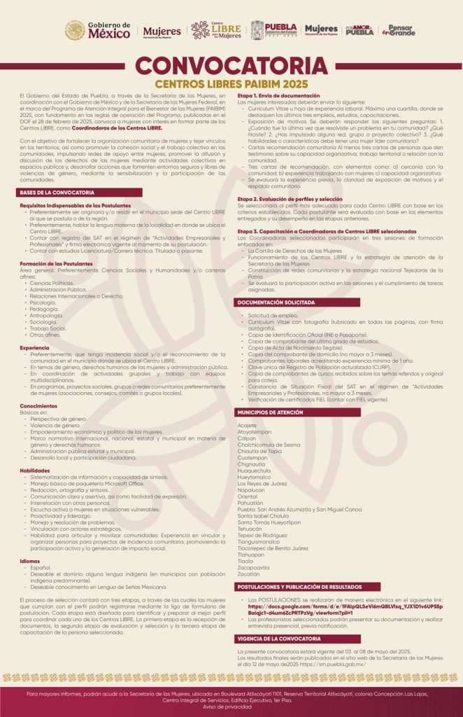 La iniciativa, impulsada a través de la Secretaría de las Mujeres en coordinación con el Gobierno de México y su homóloga federal, busca incorporar nuevos perfiles profesionales a los Centros LIBRE, espacios dedicados a la atención integral de mujeres en situación de violencia.