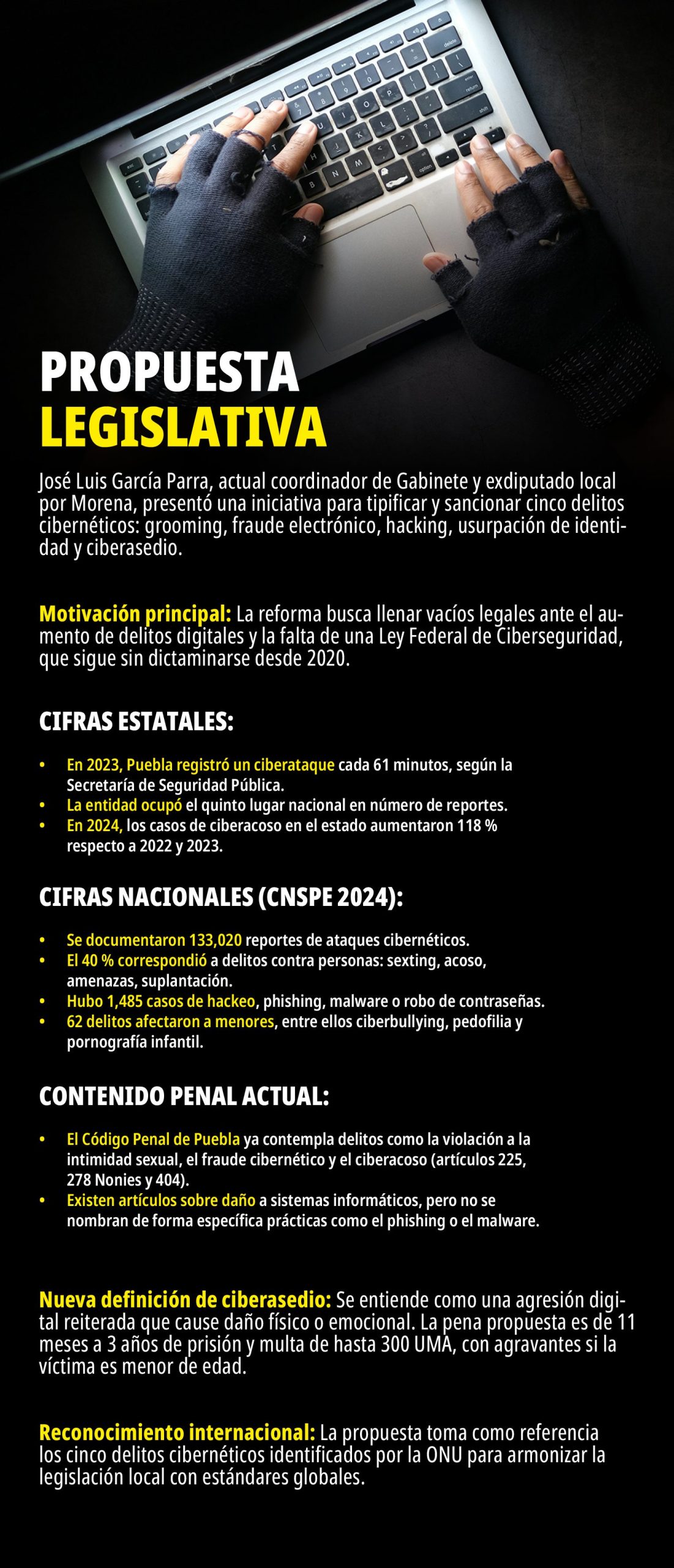 La iniciativa, discutida en la Comisión de Procuración y Administración de Justicia del Congreso del estado, surgió de la concentración de dos propuestas: la presentada el 6 de noviembre de 2024, por el entonces diputado local José Luis García Parra, en materia de ciberseguridad; y otra del diputado también de Morena, Mauricio Céspedes Peregrina, para adicionar el artículo 258 ter al Código Penal.