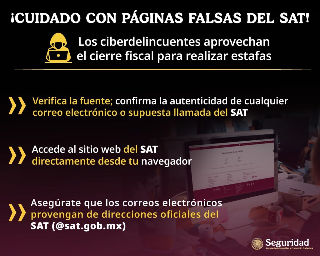 La Secretaría de Seguridad y Protección Ciudadana (SSPC) advirtió sobre campañas de fraude digital que suplantan la identidad del Sistema de Administración Tributaria (SAT). La alerta se emitió tras detectar, mediante su