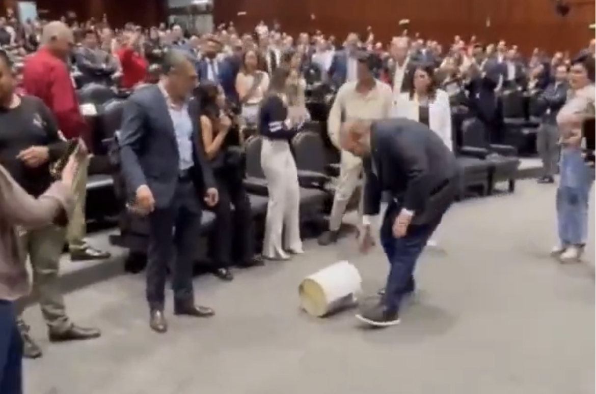 El diputado Sergio Gil colocó el recipiente cerca de la bancada de Morena, lo que provocó la reacción de la legisladora Paola Tenorio Adame, quien tomó la cubeta y la arrojó hacia los emecistas.
