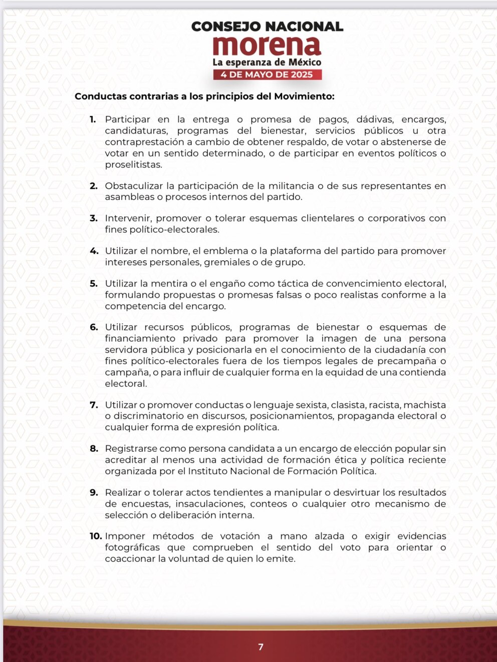 Este domingo, el Consejo Nacional de Morena, integrado por 364 consejeros, se reunió para discutir y, de ser el caso, aprobar una serie de lineamientos destinados a reforzar los principios éticos del partido. Las nuevas disposiciones buscan frenar prácticas como el nepotismo y los actos anticipados de campaña, de cara a los procesos electorales locales y federales en curso.
