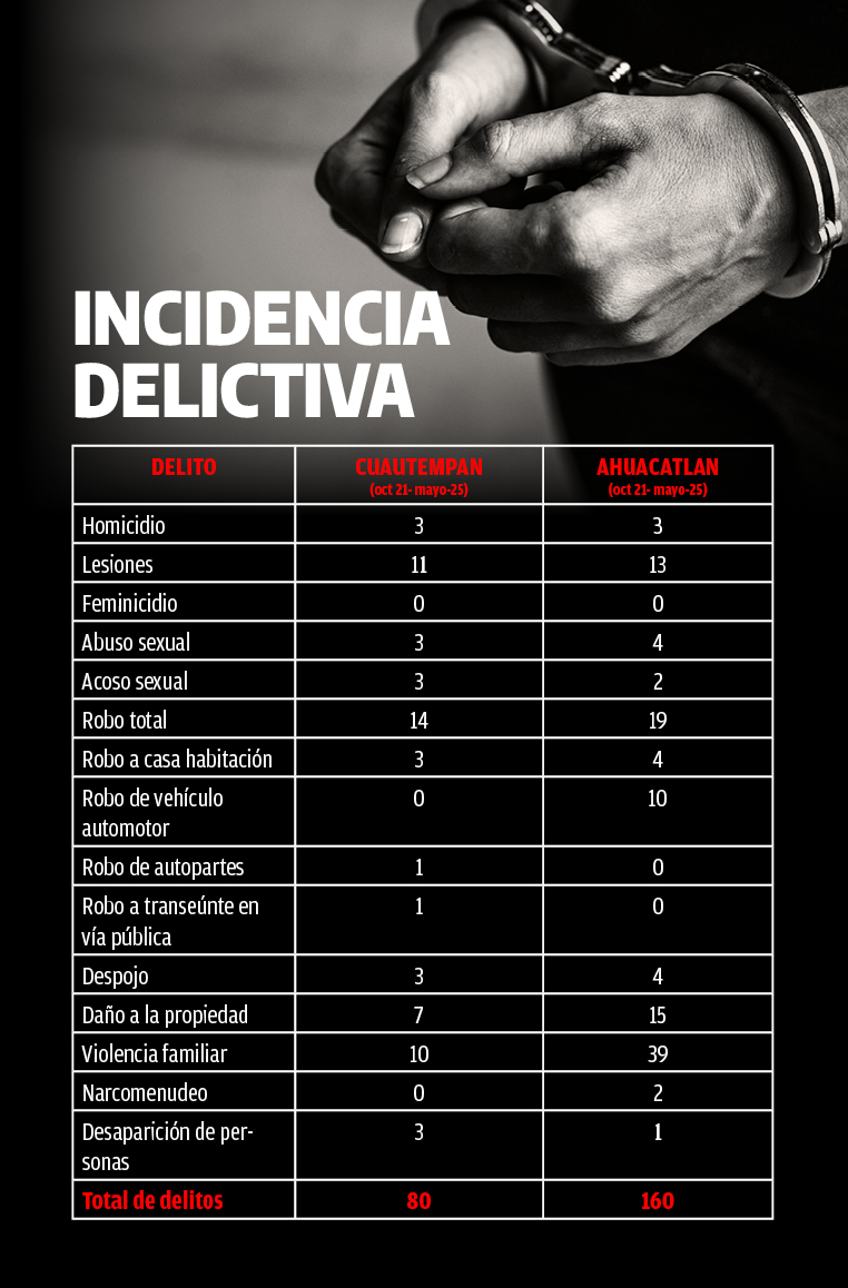 Este contexto es clave para entender lo ocurrido hace unos días en el dispositivo montado por las autoridades, pero también para analizar el comportamiento de la incidencia delictiva en Cuautempan y Ahuacatlán. Los números lo evidencian: entre octubre de 2021, -cuando Gerardo Cortés Caballero tomó las riendas de Cuautempan- y mayo de 2025, ese municipio acumuló 80 carpetas de investigación por distintos delitos, mientras que Ahuacatlán duplicó esta cifra con 160 casos, según datos oficiales de la Fiscalía General del Estado.