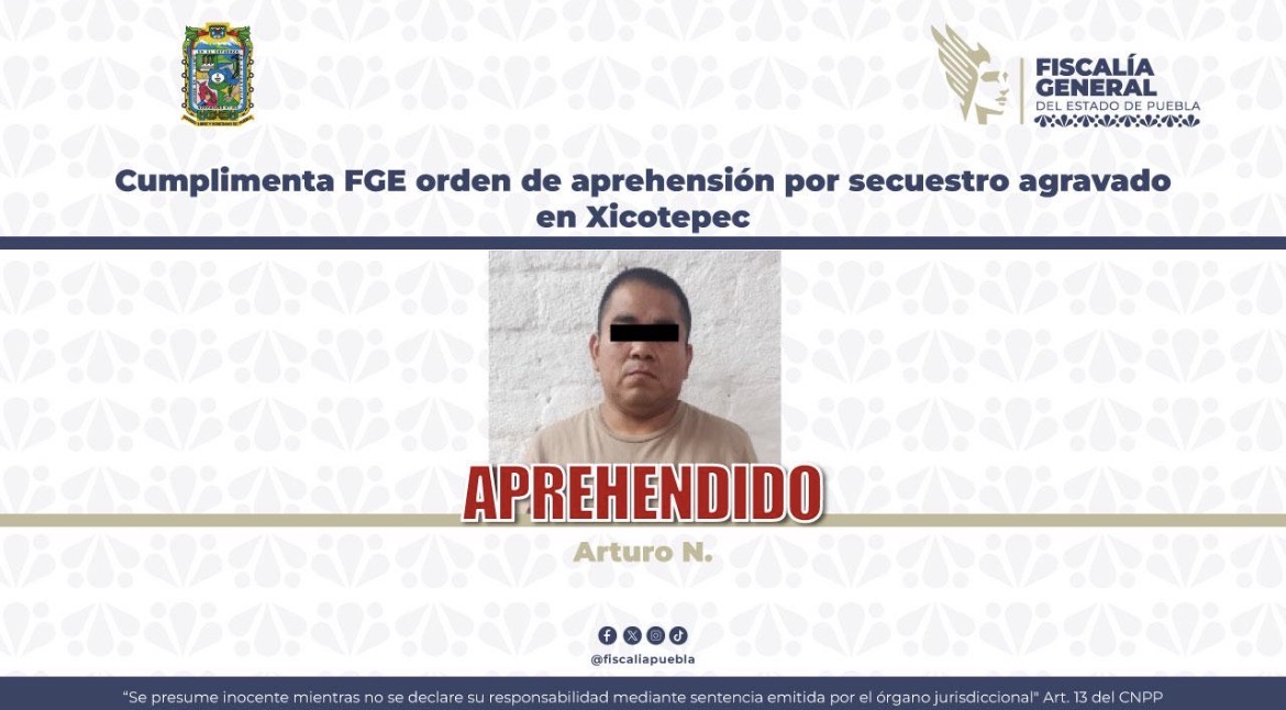 Como resultado de actos de investigación, la Fiscalía General del Estado de Puebla (FGE), a través de la Fiscalía Especializada en Investigación de Secuestro y Extorsión, cumplimentó una orden de aprehensión en contra de contra de Arturo N., alias “Ángel Arturo N.”, “José Arturo N.” o “José Ángel N.”, de 43 años, por su probable responsabilidad en el delito de secuestro agravado en el municipio de Xicotepec de Juárez.