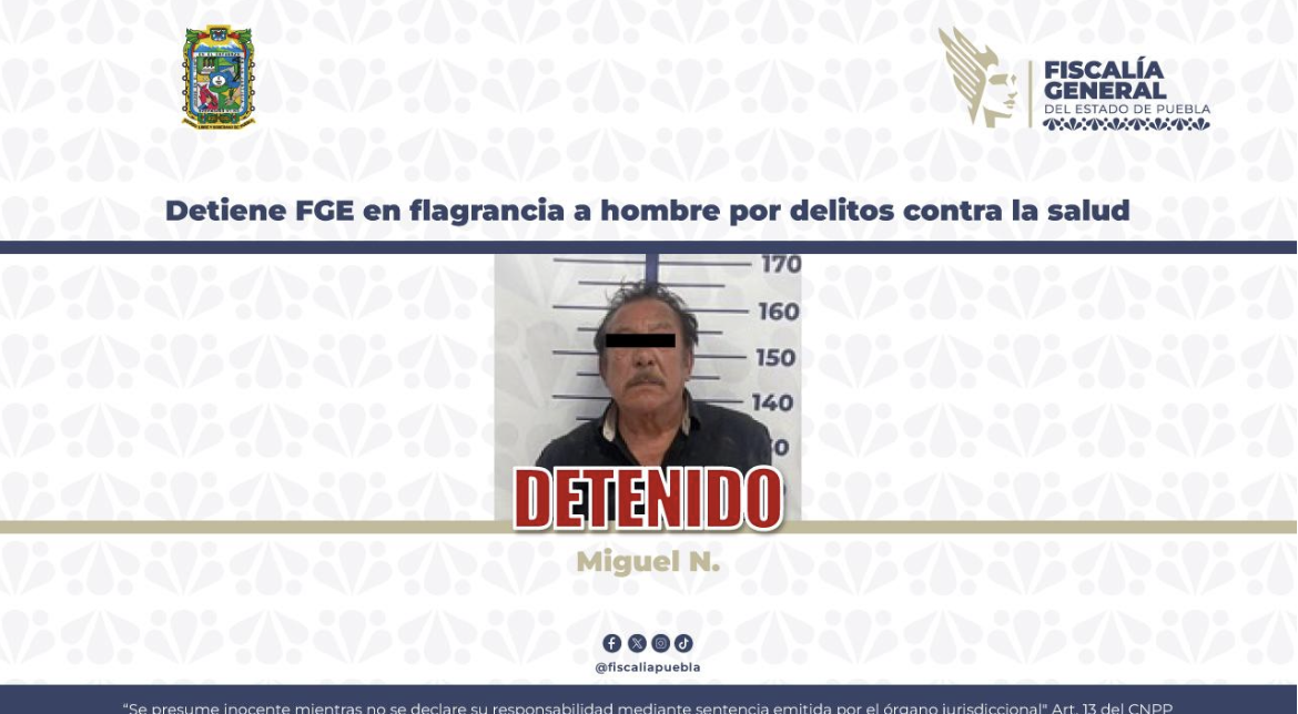 Como resultado de recorridos de vigilancia, la Fiscalía General del Estado de Puebla (FGE) detuvo en flagrancia a Miguel N., de 72 años, como probable responsable de delitos contra la salud en su modalidad de suministro de narcótico, por hechos ocurridos en la ciudad de Puebla.