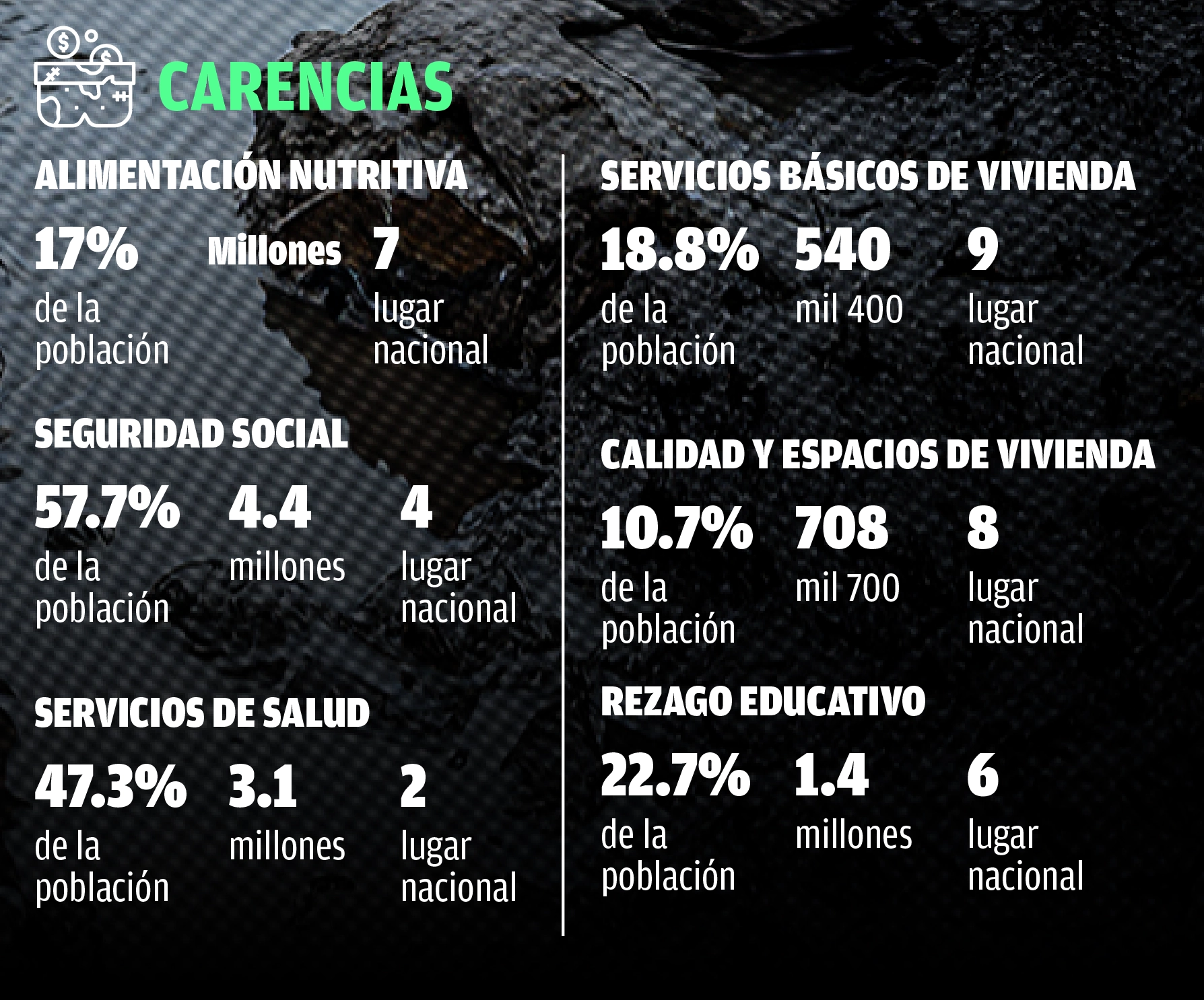 Junto a Puebla, otros estados que fueron integrados en la lista de pobreza multidimensional son Chiapas, con 66.0 por ciento; Guerrero, con 58.1 por ciento; Oaxaca, con 51.6 por ciento y Veracruz, con 44.5 por ciento.