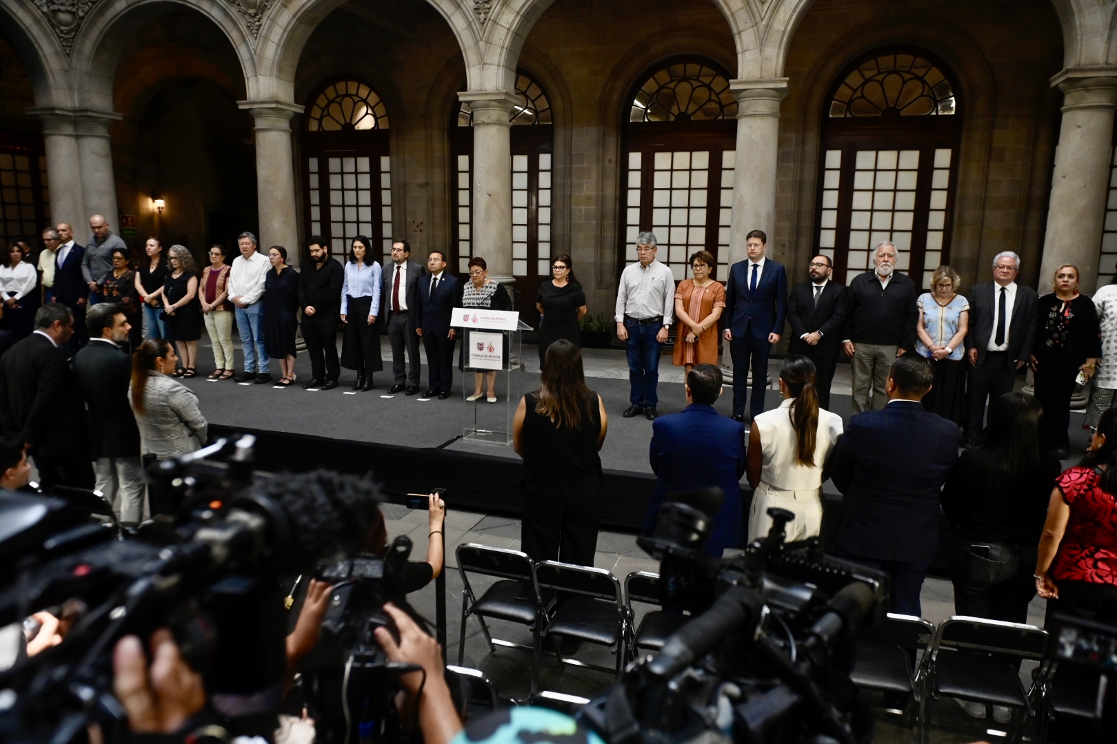 Vestida de luto y visiblemente consternada, Brugada apareció acompañada por todo su gabinete, el presidente del Poder Judicial capitalino, Rafael Guerra, la asesora jurídica de la Presidencia, Ernestina Godoy, así como alcaldes y diputados de Morena.