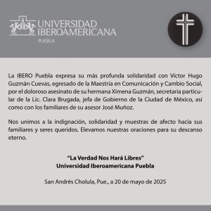 En Puebla, la Universidad Iberoamericana se sumó al luto. En un pronunciamiento público, la IBERO Puebla manifestó su “más profunda solidaridad con Víctor Hugo Guzmán Cuevas, egresado de la Maestría en Comunicación y Cambio Social, por el doloroso asesinato de su hermana Ximena Guzmán”.