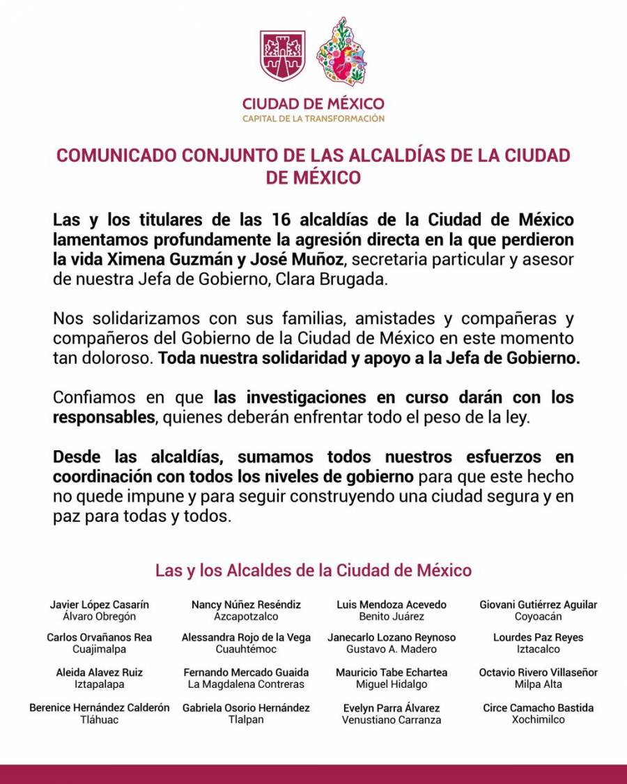 Las 16 alcaldías de la Ciudad de México emitieron un comunicado conjunto en el que expresaron su profunda tristeza por el asesinato de Ximena Guzmán y José Muñoz, secretaria particular y asesor de la Jefa de Gobierno, Clara Brugada.