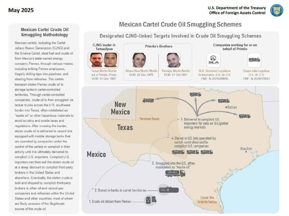 El combustible robado se vende en el mercado negro en México, Estados Unidos y Centroamérica. Llega a territorio estadounidense «a través de corredores mexicanos» a menudo etiquetado como «aceite de desecho» u otro material peligroso, informa el comunicado del Departamento del Tesoro.
