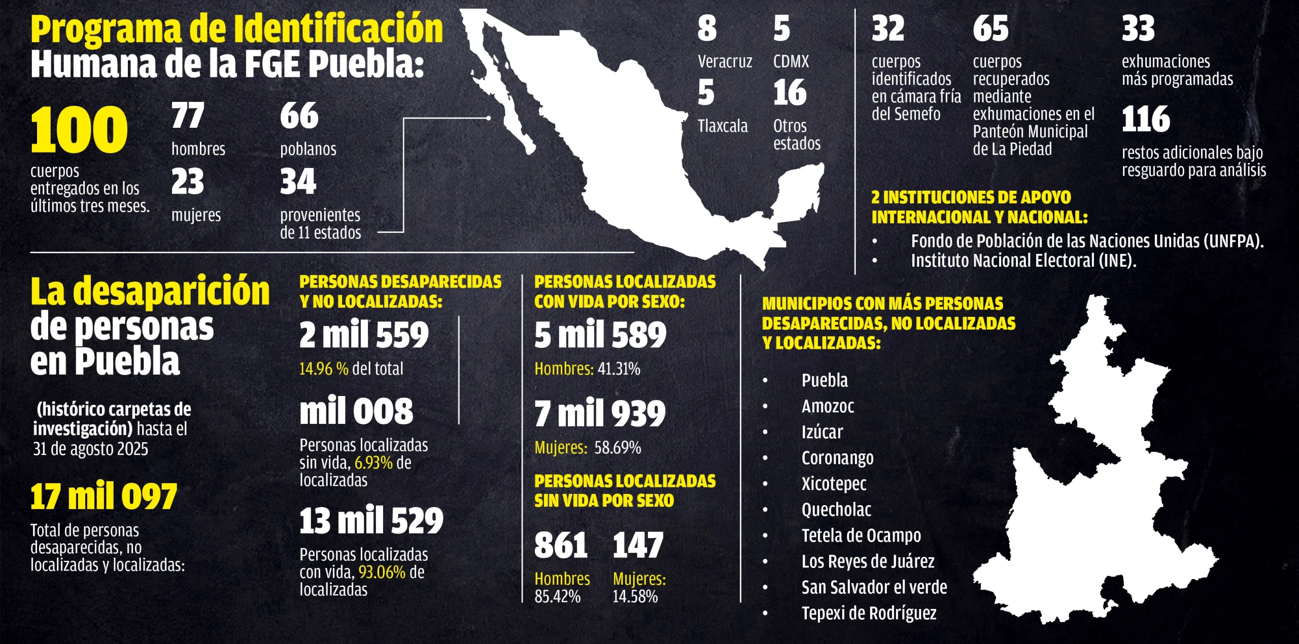 El funcionario detalló que, de los 100 cuerpos entregados, 66 pertenecen a personas originarias de Puebla y el resto a individuos de otras 11 entidades, entre ellas Veracruz, Tlaxcala y Ciudad de México.