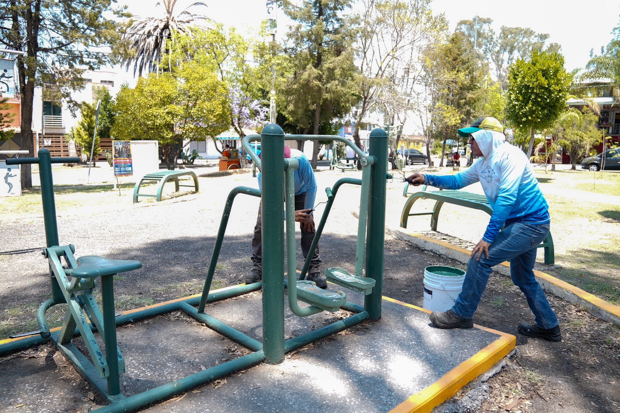 En la colonia Arboledas de Guadalupe, se realizaron labores de pintura en 11 ejercitadores, ocho bancas y cinco juegos infantiles, además de la reparación de un ejercitador y dos columpios, acciones que permiten garantizar instalaciones seguras y en buen estado para el uso de la ciudadanía.