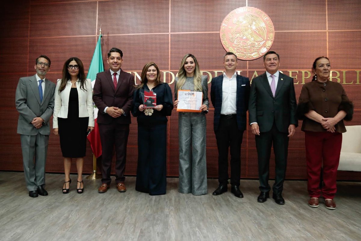 En el Senado de la República, las titulares de la Coordinación General de Transparencia y Municipio Abierto, Laura Elizabeth García González y de la Secretaría de las Mujeres, Zaira González Gómez, recibieron el galardón por parte del Laboratorio de Innovación y Transformación Digital.