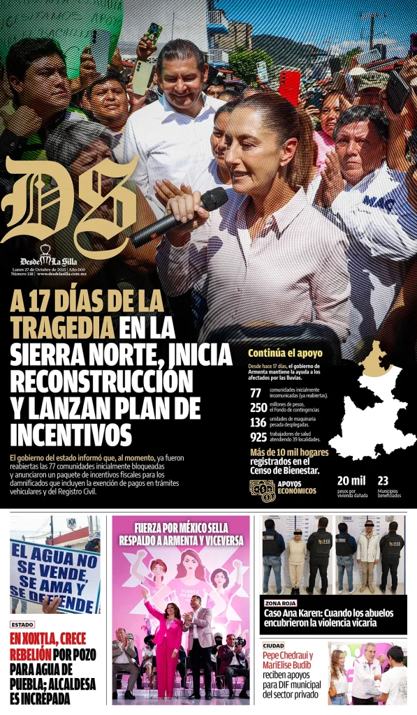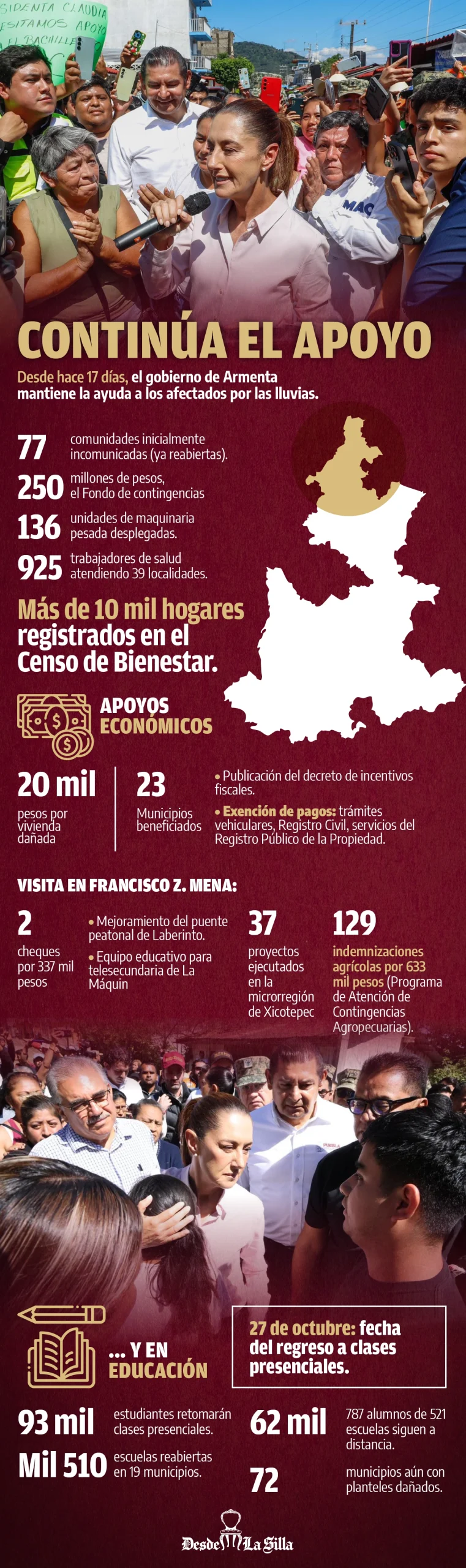 En un comunicado, informaron que Alejandro Armenta recorrió personalmente las zonas más golpeadas, acompañado de su gabinete y de las Fuerzas Armadas, mientras que la presidenta Claudia Sheinbaum también ha estado presente en tres ocasiones: los días 12, 19 y 23 de octubre.