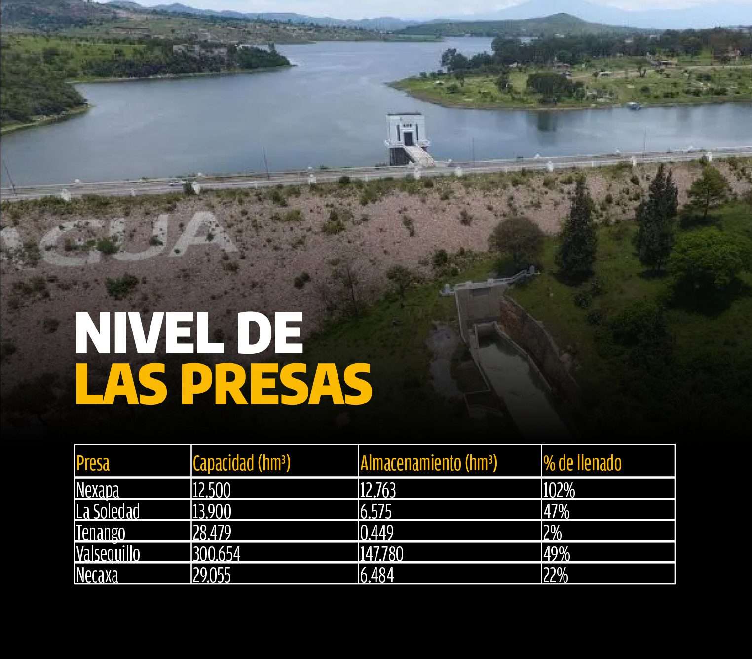 En su último informe del 24 de abril, CONAGUA indicó que, aunque la presa Nexapa ya superó el 100 por ciento de su capacidad, el resto de los cuerpos de agua en el estado permanecen por debajo del 50 por ciento de llenado:
