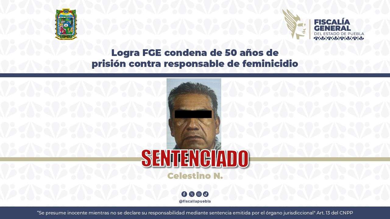 La Fiscalía General del Estado de Puebla (FGE) obtuvo sentencia condenatoria en contra de Celestino N., al acreditarse su responsabilidad en el delito de feminicidio.