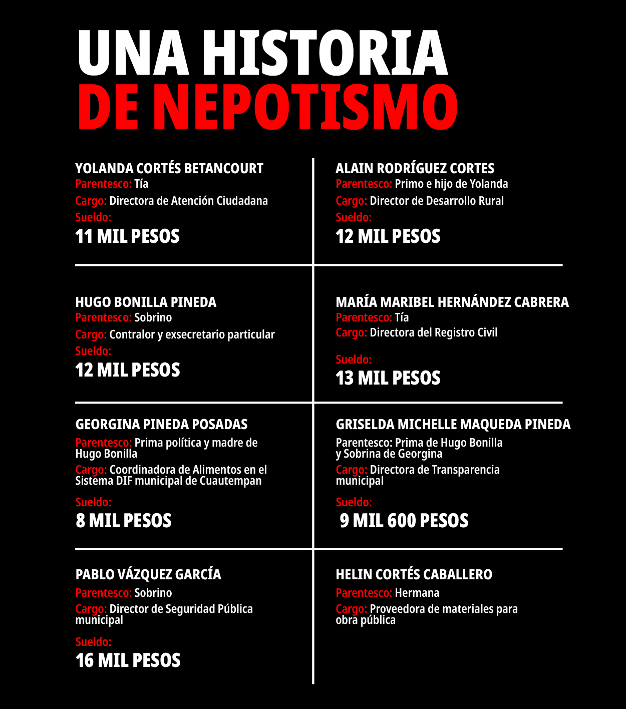 Otros familiares que evidenciaron son María Maribel Hernández Cabrera, reconocida como tía del edil, quien gana un salario de 13 mil 500 pesos como directora del Registro Civil y Pablo Vázquez García, director de Seguridad Pública municipal, sobrino del edil, quien percibe un sueldo de 16 mil pesos.