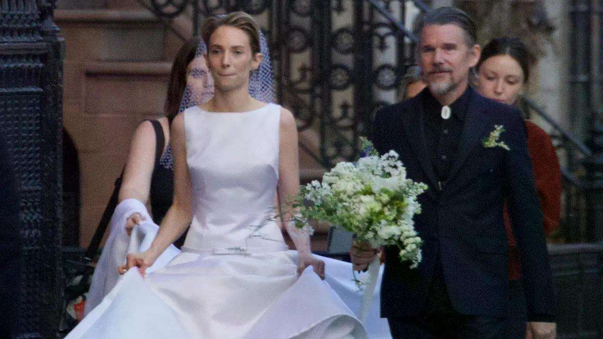 Hawke, de 27 años, lució un vestido blanco sin mangas con falda voluminosa y chaqueta corta, evocando un aire retro; Hutson optó por esmoquin negro clásico. Su padre, el actor Ethan Hawke, la acompañó al altar, mientras que su madre, Uma Thurman, estuvo presente en primera fila.