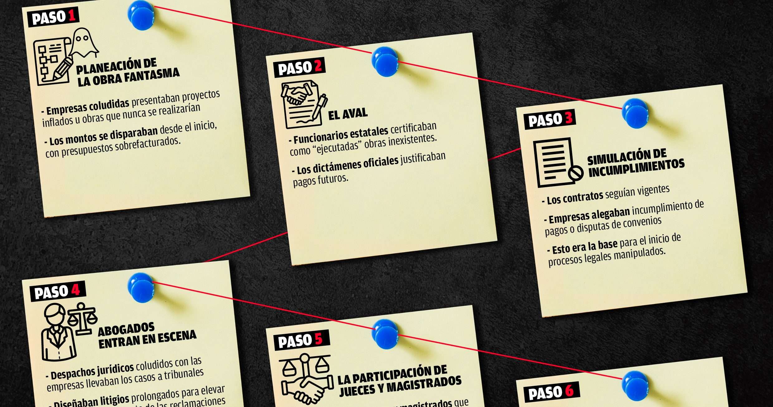Según su explicación, la ingeniería del fraude se repetía una y otra vez: empresas presentaban proyectos sobrefacturados, funcionarios certificaban obras que no se ejecutaban y posteriormente, abogados coludidos acudían a tribunales donde jueces y magistrados dictaban resoluciones favorables para liberar recursos públicos.