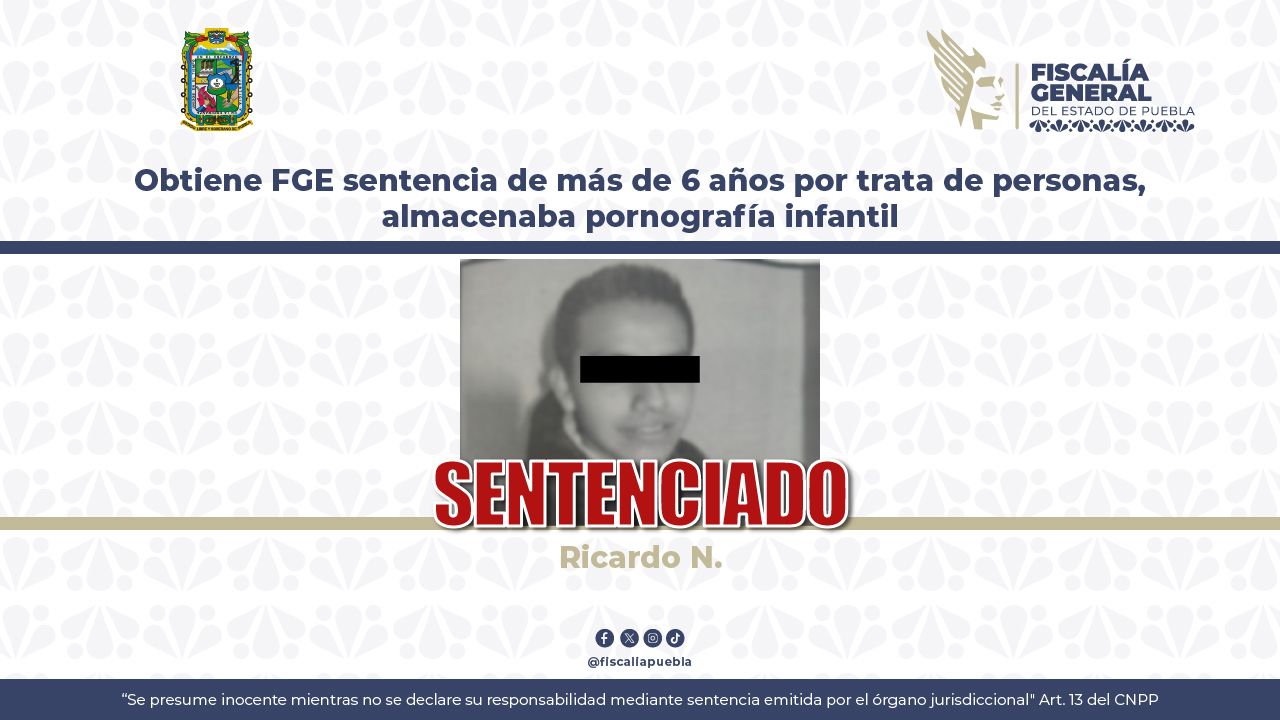 Como resultado del proceso penal, la Fiscalía General del Estado de Puebla (FGE) obtuvo sentencia condenatoria en contra de Ricardo N., de 30 años, por su responsabilidad en el delito de trata de personas en su modalidad de otras formas de explotación sexual; hecho registrado en la capital de Puebla.