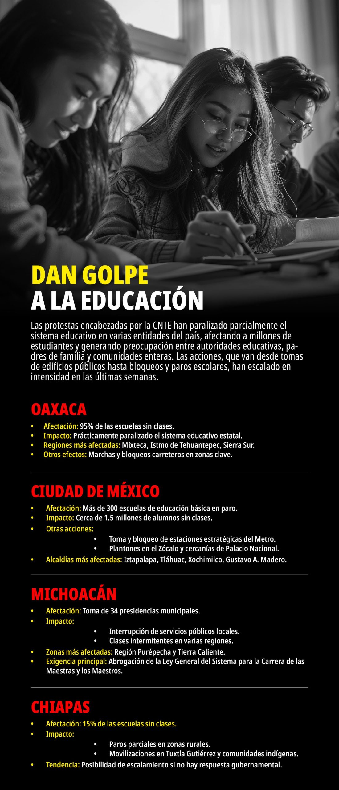 En Oaxaca, el bastión histórico de la CNTE, el impacto ha sido el más severo: el 95% de las escuelas se han quedado sin clases debido al paro indefinido y a las constantes movilizaciones magisteriales. Las regiones más afectadas son la Mixteca, el Istmo de Tehuantepec y la Sierra Sur, donde las actividades escolares están prácticamente suspendidas desde hace más de una semana. Padres de familia han comenzado a exigir a las autoridades estatales y federales que se garantice el derecho a la educación de sus hijos.
