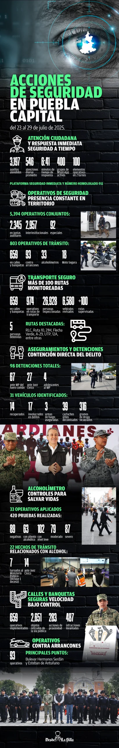 Uno de los ejes estratégicos ha sido el fortalecimiento de la vigilancia en colonias y juntas auxiliares, donde se desplegaron operativos en planteles educativos, centros vecinales y zonas con alta incidencia delictiva. Destacan acciones en San Jerónimo Caleras con 595 operativos, San Pablo Xochimehuacan con 430, Totimehuacan con 263, Xonacatepec con 63, y Azumiatla con 25, entre otras.
