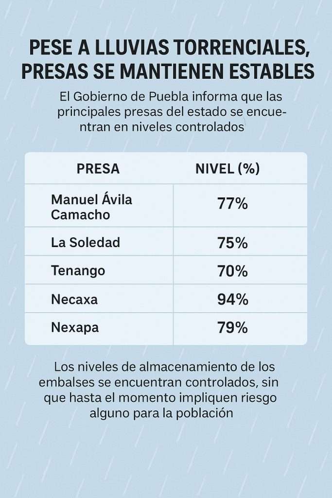 Mientras las lluvias continúan azotando distintos puntos del estado, el Gobierno de Puebla aseguró que las principales presas se mantienen estables y no representan riesgo para la población.
