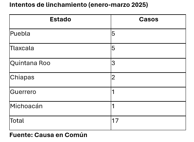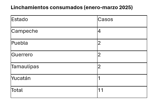 A nivel de linchamientos consumados, Puebla también figura con dos casos en este mismo período, aunque la cifra total de muertes por esta práctica fue más alta en el estado de Campeche, que reportó cuatro casos.