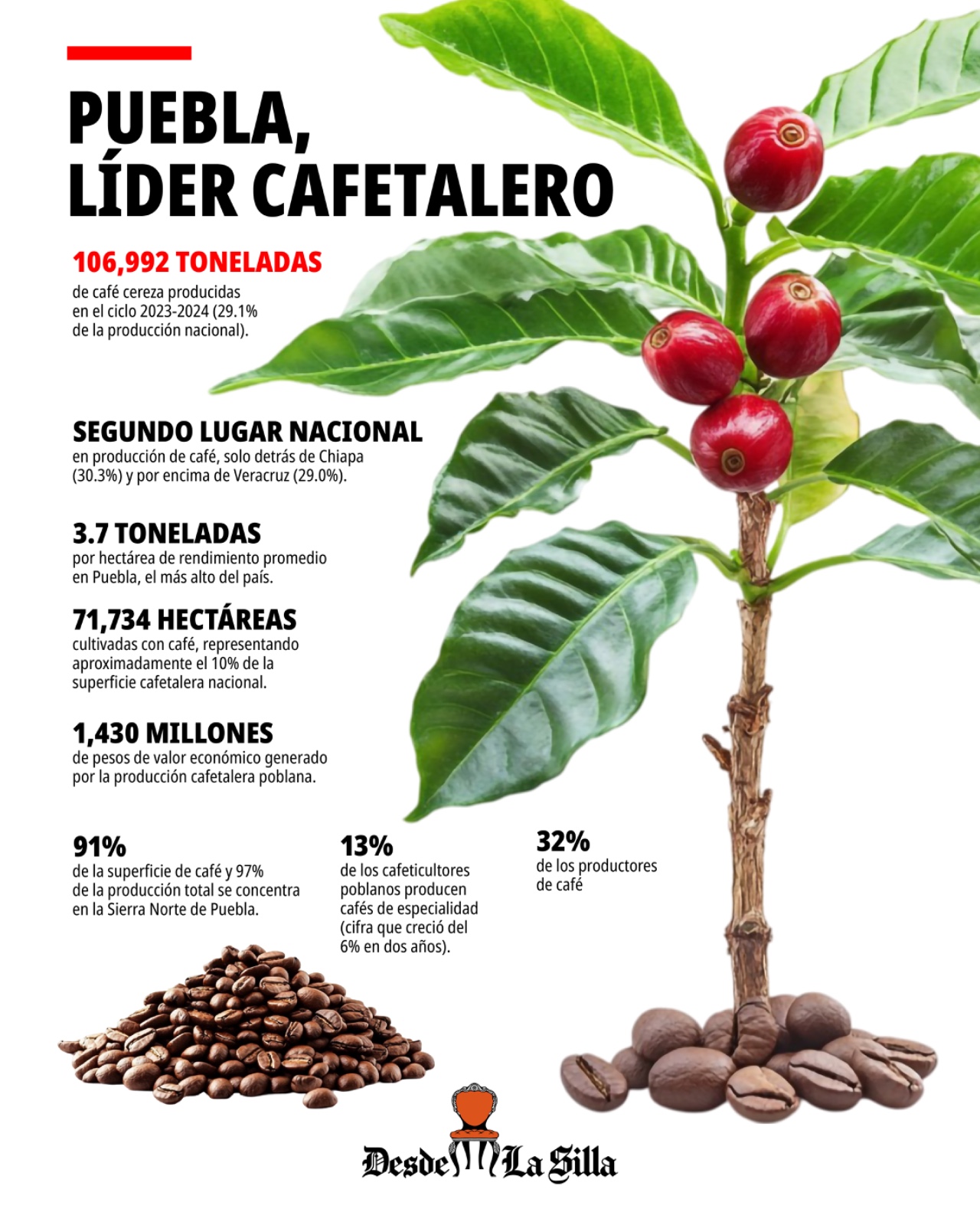 Según datos de la Secretaría de Agricultura y Desarrollo Rural (SADER), Chiapas aporta aproximadamente 40% del café mexicano, le sigue Puebla con 30% y luego Veracruz con 24%.