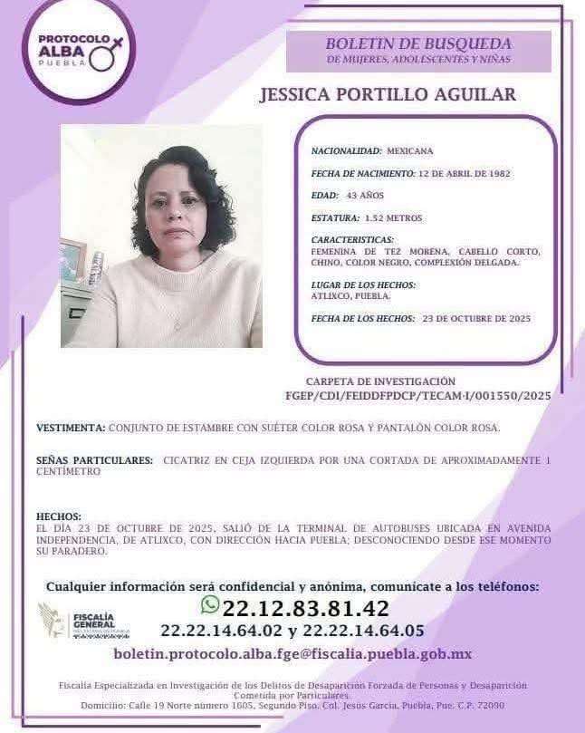 Jessica Portillo Aguilar, de 43 años, es docente de la Telesecundaria Rafael Moreno Valle, en la comunidad de Axocopan, Atlixco, y madre de un adolescente de 14 años. Su familia, residente en la colonia León, pidió apoyo ciudadano para difundir su fotografía y aportar información que ayude a localizarla.