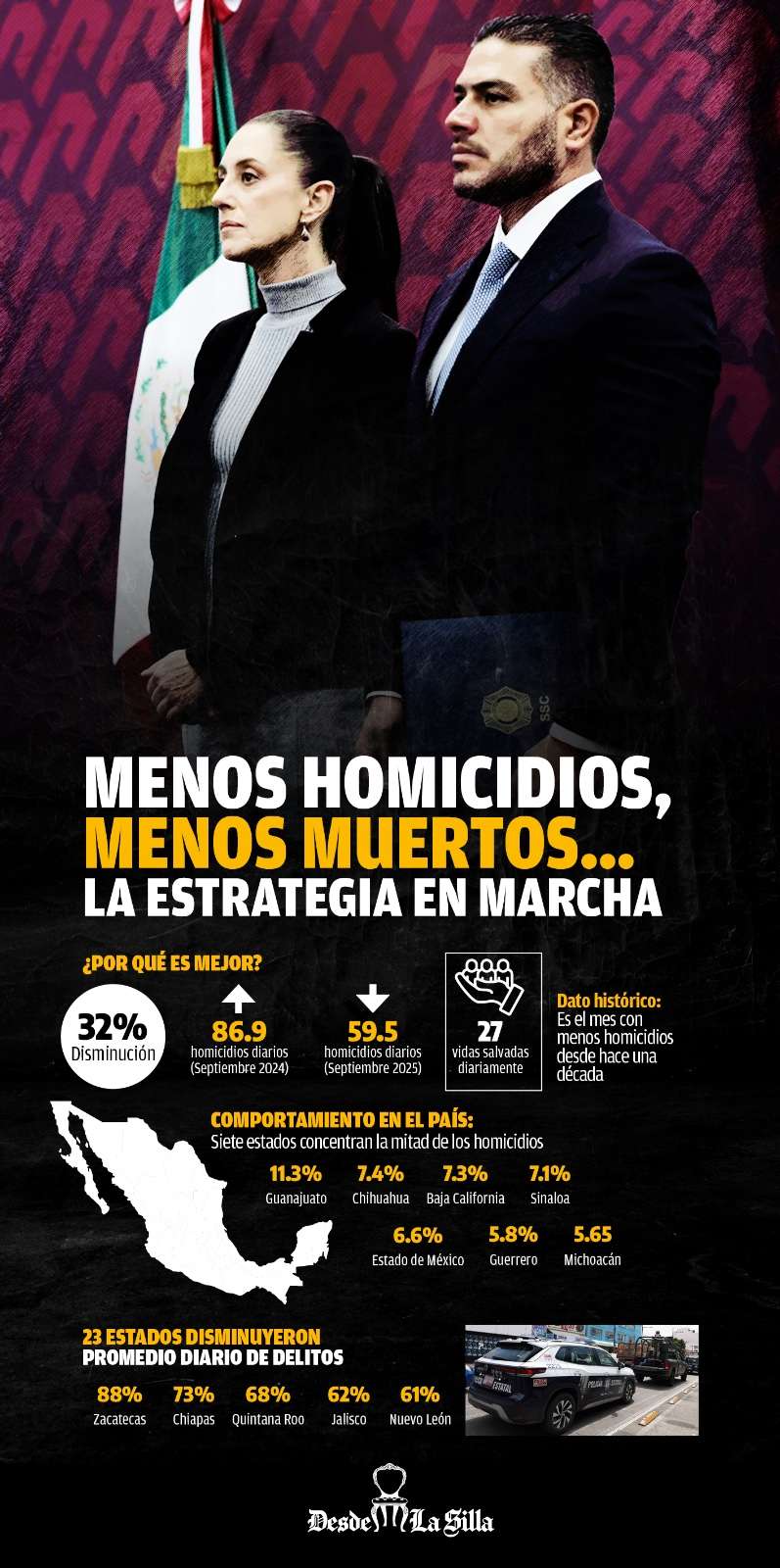 La Presidenta Claudia Sheinbaum Pardo resaltó que, a un año de gobierno, la reducción de 32 por ciento en los homicidios dolosos, entre septiembre de 2024 y septiembre de 2025, es muy significativa ya que representa 27 personas que no fallecen diariamente y lo atribuyó a la implementación de los cuatro ejes de la Estrategia Nacional de Seguridad.