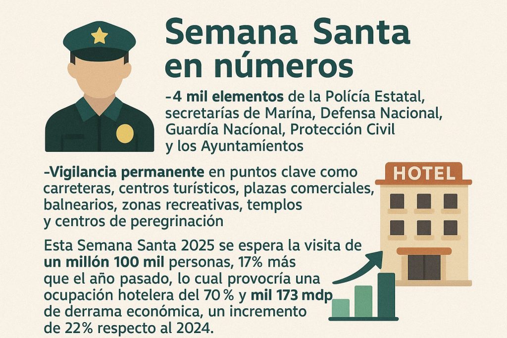 Los cuerpos de seguridad tendrán un gran reto, ya que esta Semana Santa 2025 se espera la visita de un millón 100 mil personas, 17 por ciento más que el año pasado, lo cual provocaría una ocupación hotelera de 70 por ciento y mil 173 millones de pesos de derrama económica, un incremento de 22 por ciento respecto a 2024.