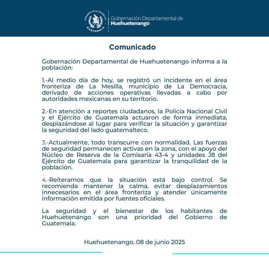 Horas después, la Cancillería de Guatemala informó en un comunicado que entregó una nota de protesta a la Secretaría de Relaciones Exteriores de México por la incursión de elementos de las Fuerza de Reacción Inmediata (Pakal) de Chiapas al territorio guatemalteco y pidió a las autoridades mexicanas investigar “este grave incidente”, así como el respeto recíproco en las zonas fronterizas.