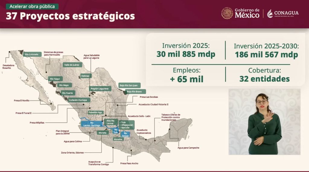 Conagua precisó que para 2025 se ejercerán 30 mil 885 millones de pesos en 37 proyectos estratégicos, con una estimación de más de 65 mil empleos directos.