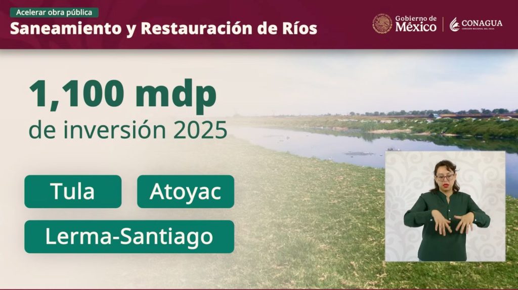 En materia de saneamiento y restauración de ríos, se proyecta una inversión de mil 100 millones de pesos en 2025 para la recuperación ecológica de cuerpos de agua como el Tula, Atoyac y Lerma-Santiago.