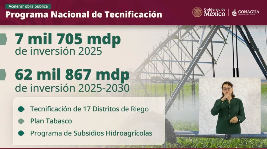 Destaca el Programa Nacional de Tecnificación del Riego, con una inversión sexenal de 62 mil 867 millones de pesos para modernizar 240 mil hectáreas agrícolas en 17 distritos de riego.
