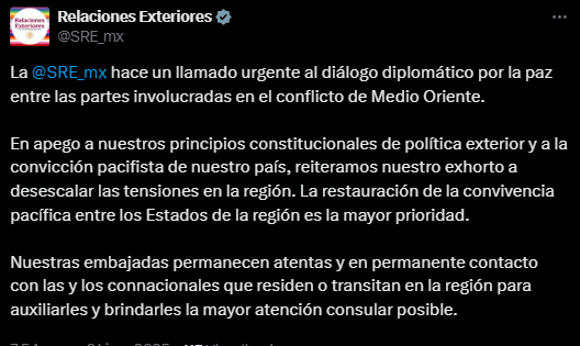 La SRE exhortó a quienes ya se encuentran en la región a permanecer en lugares seguros, evitar desplazamientos innecesarios y seguir las indicaciones de autoridades locales y representaciones diplomáticas mexicanas.