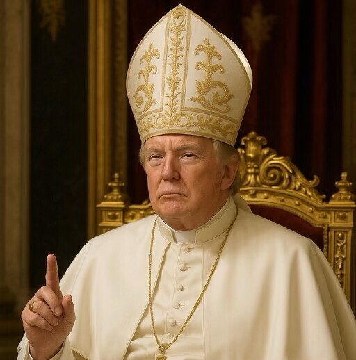 La foto a color difundida por Trump en su red Truth Social lo muestra sentado con aire solemne en un sillón, vestido con la sotana blanca papal, coronado con la mitra y luciendo la imponente cruz de oro. Tiene la mano izquierda apoyada en el muslo y el índice derecho levantado hacia el cielo.