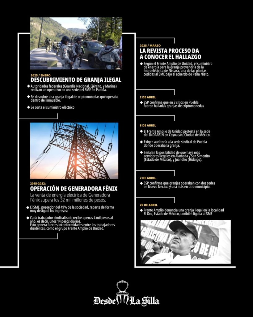 Nuevos indicios apuntan a que el robo de electricidad vinculado a la cúpula del Sindicato Mexicano de Electricistas (SME) no se limita a Puebla. Como Desde la Silla adelantó, ya existían sospechas de que en las instalaciones en Juandhó, Hidalgo, bastión de Martín Esparza, se operaba una granja de criptomonedas; ahora, fotografías captadas por extrabajadores y nuevos testimonios confirmarían esta hipótesis.
