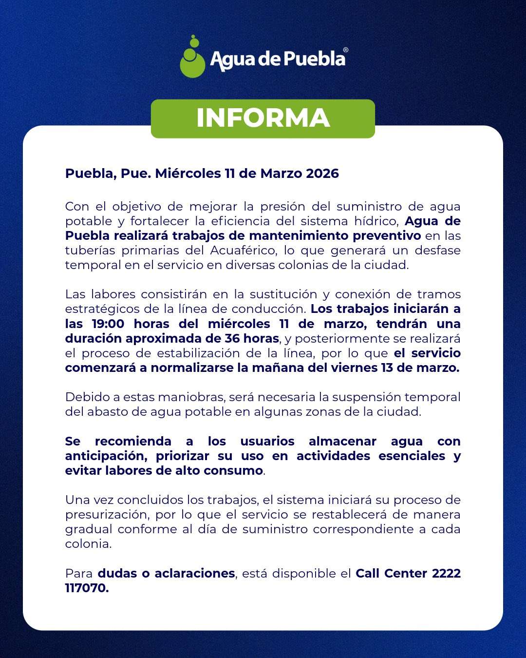 La empresa pidió a los habitantes guardar agua en tinacos, cubetas o tambos, usarla con cuidado y seguir sus comunicados oficiales para conocer el avance de las labores. Este tipo de mantenimiento es habitual, pero genera molestias, sobre todo durante la temporada de calor, cuando la presión de agua ya es limitada.