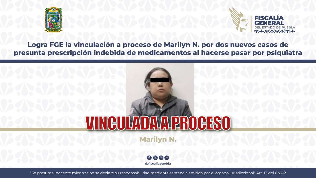 La Fiscalía General del Estado informa que, derivado de la investigación de dos nuevos casos denunciados en contra de Marilyn N., por presuntamente proporcionar atención psiquiátrica y prescribir medicamento controlado a pacientes haciéndose pasar como psiquiatra, se expusieron diversos datos de prueba ante la autoridad judicial, logrando su vinculación a proceso como probable responsable del delito de usurpación de funciones.