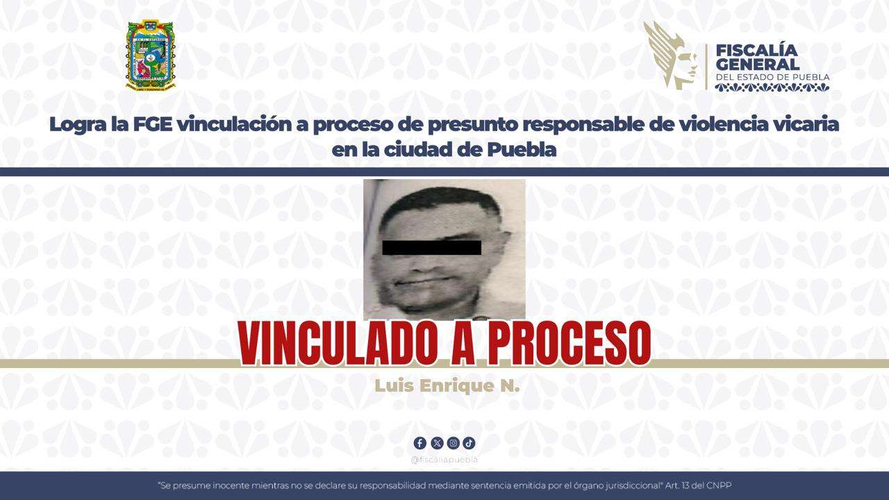 La Fiscalía General del Estado de Puebla obtuvo de la autoridad judicial la vinculación a proceso de Luis Enrique N., de 43 años, por su probable responsabilidad en los delitos de violencia familiar con su agravante de violencia vicaria y sustracción de menores.
